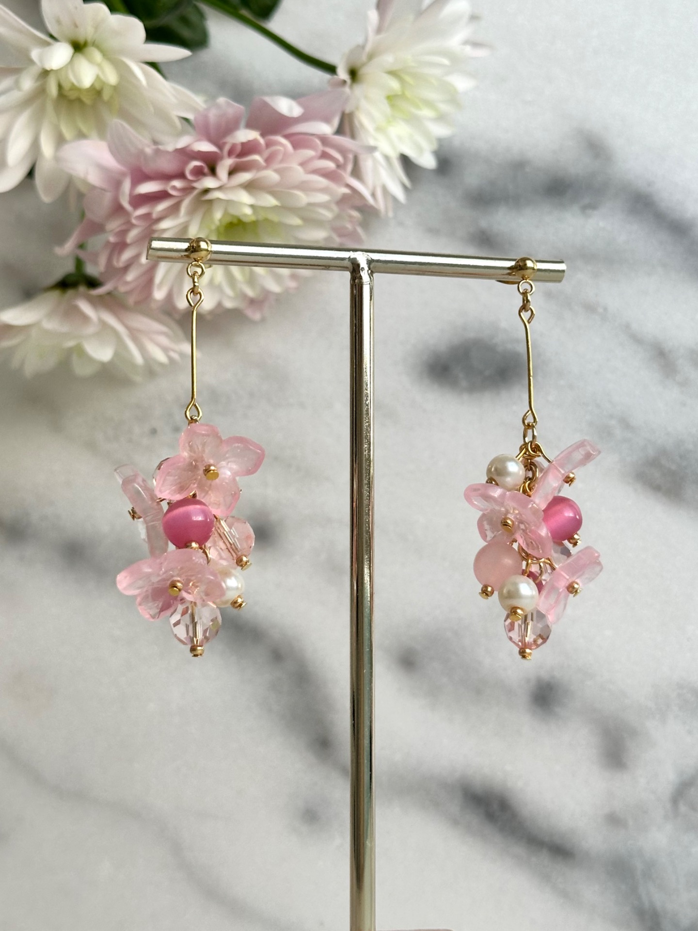 Erilaisista vaaleanpunaisen sävyisistä lasihelmistä tehdyt Kirsikankukka-korvakorut. Korvakorutappi ja välirenkaat kullattua kirurginterästä. Mitat: Pituus: 6,5cm Leveys: 2cm