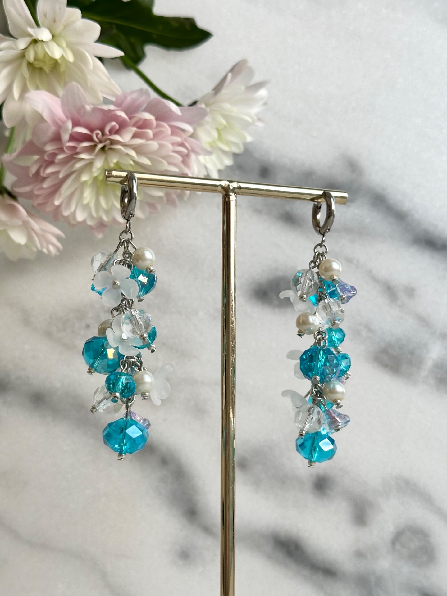 Uniikkipari! Näyttävät korvakorut turkooseista ja valkoisista lasihelmistä, sekä akryylikukista. Korvakorurengas ja välirenkaat kirurginterästä. Mitat: Pituus: 6,5cm Leveys: 2cm