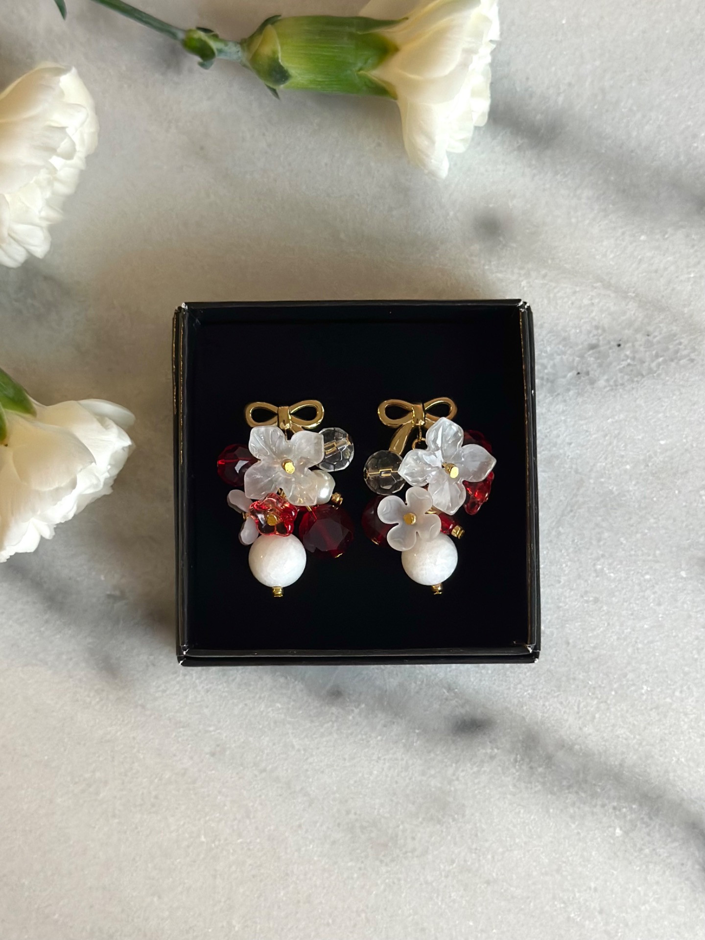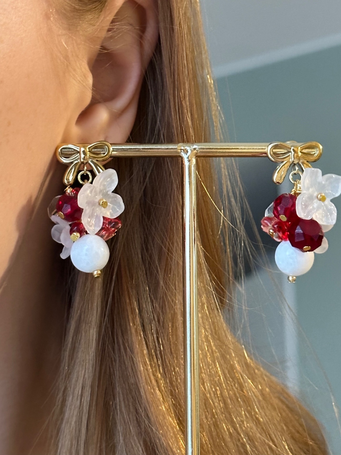 Täydelliset korvikset jouluun! Kristallilasihelmet, kukkahelmet lasia ja akryyliä sekä valkoinen Jade-kivihelmi.