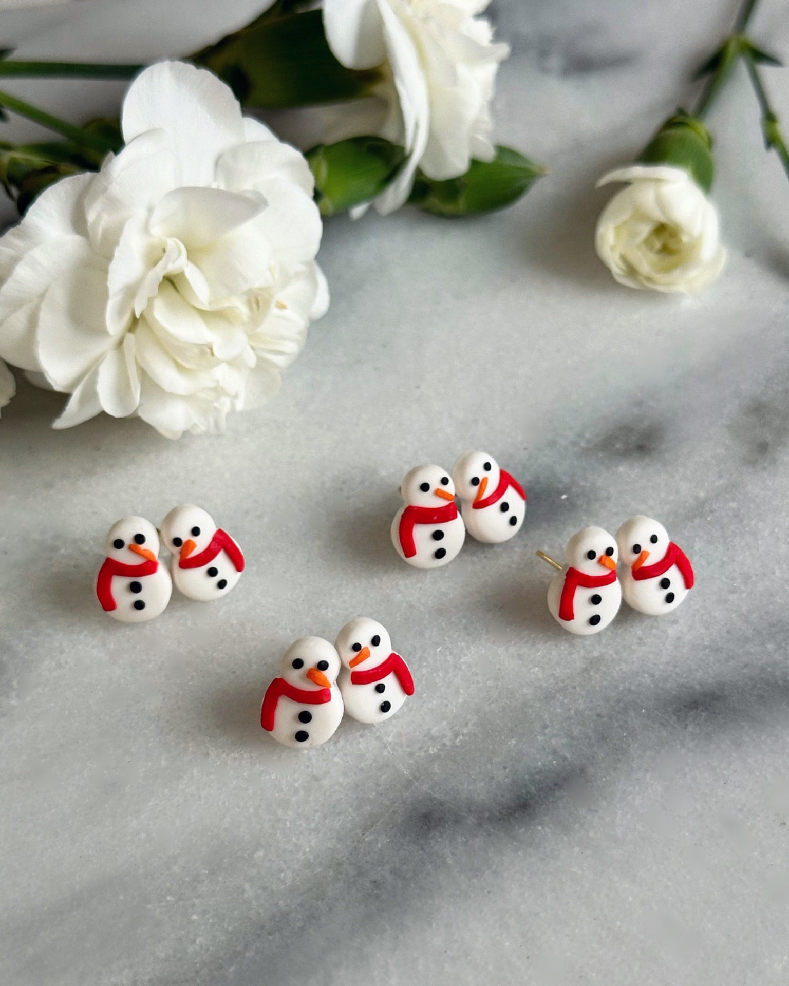Hauskat pienet lumiukkonappikorvikset. Kaikki kuvioinnit tehty käsin fimomassasta.