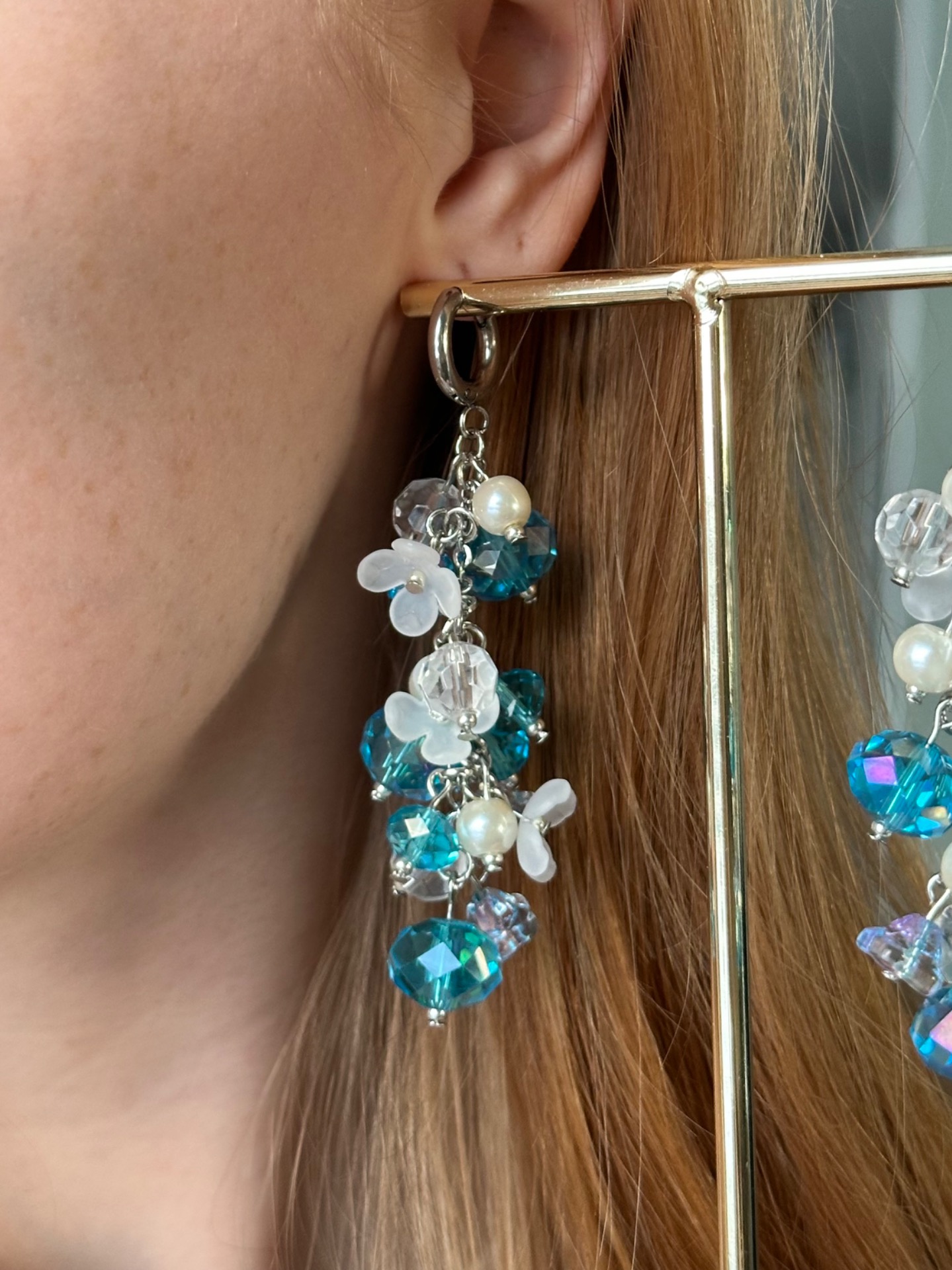 Uniikkipari! Näyttävät korvakorut turkooseista ja valkoisista lasihelmistä, sekä akryylikukista.